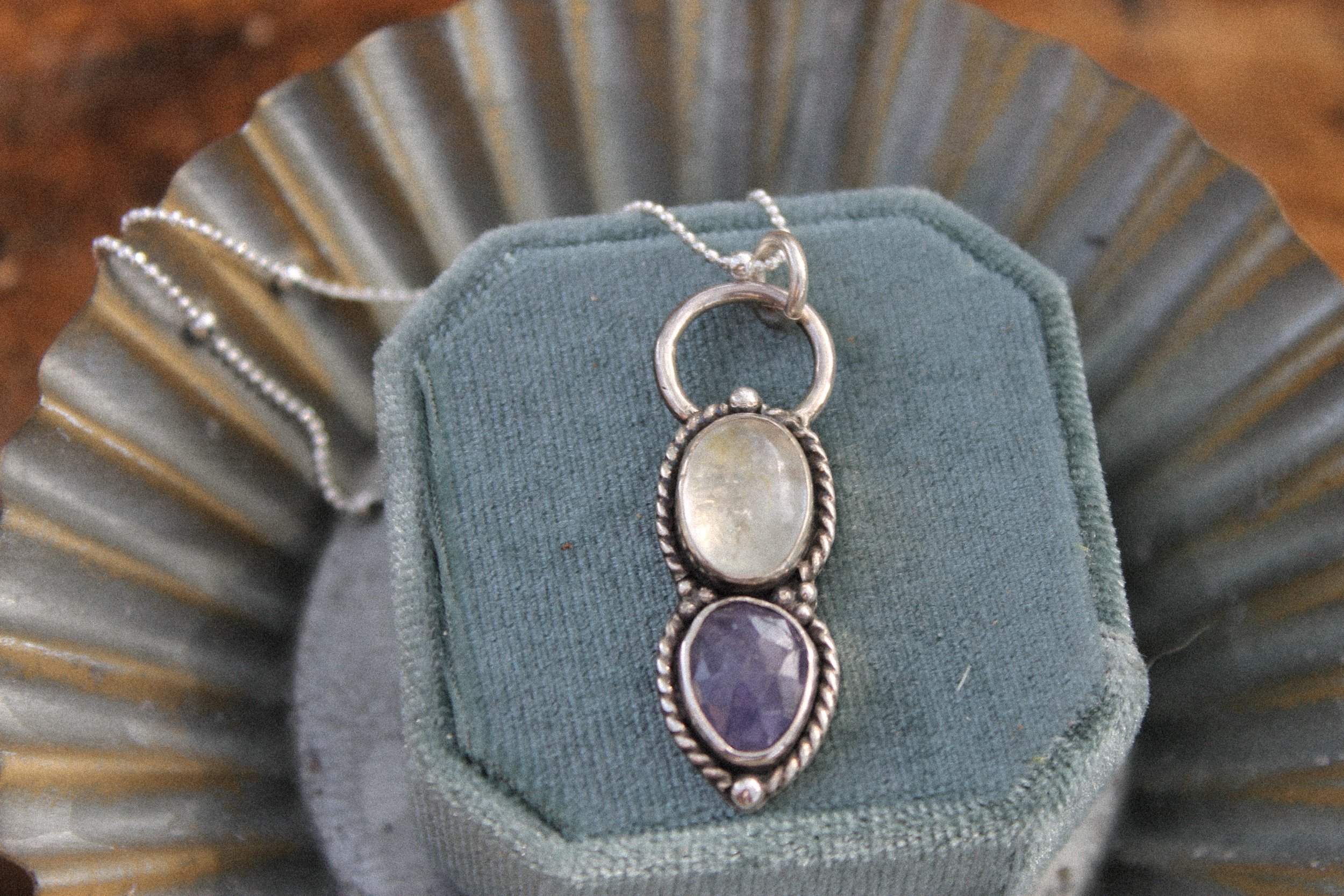 This exquisite pendant features a harmonious pairing of tanzanite and topaz, each gemstone set in sterling silver with intricate rope and bead detailing.